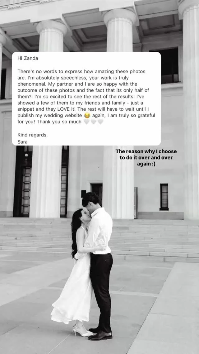 I will try to make you laugh and will ask you to enjoy moments together to capture natural, emotion filled photos. In ceremony I will try to be invisible but quickly move around and document how the day unfolds. I will be there to guide you all through a bridal shoot and help to come up with unique ideas. And if you think we could be a great team on your wedding day, contact me! We can meet for a coffee or tea and see if we are meant to work together. Don't forget to read the testimonials. Do you have more questions? See if yours is already answered here: